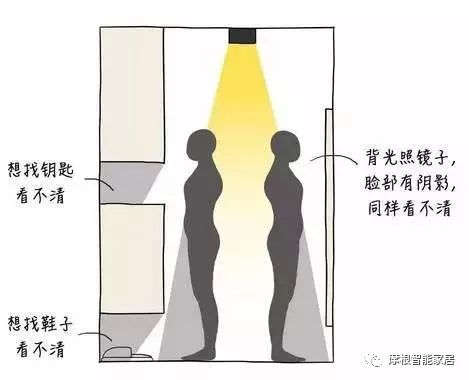 传统的灯光只是起到了一个基础照明的作用,没有考虑到使用起来的方便性。人的身体会阻挡住焦点光,有限的光源也会让玄关柜的阴影阻挡视线。而且一进门,就要摸黑去找开关,导致来访,换鞋都很不方便。