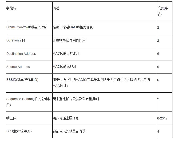 要深入了解WiFi探针技术,首先先认识WiFi使用的网络协议,WiFi采用的是IEEE802.11协议集,此协议集包含许多子协议。其中按照时间顺序发展,主要有: (1)802.11a,(2)802.11b,(3)802.11g(4)802.11n。 在网络通信中,数据被封装成了帧,帧就是指通信中的一个数据块。但是帧在数据链路层传输的时候是有固定格式的,不是随便的封装和打包就可以传输,大小有限制,最小46字节,最大1500字节所以我们必须按照这个规则来封装。下面802.11的帧结构: