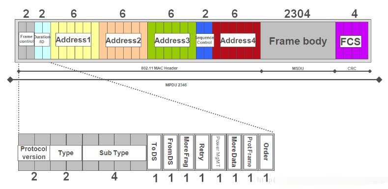 从上面的结构可以知道,前俩个字节为:帧控制字段。 控制字段的前2bit节为:协议类型,目前此值为:0。