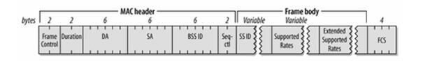 ProbeRequest:探测请求帧,WiFi设备将会利用ProbeRequest帧,扫描所在区域内目前有哪些802.11网络。下图是帧格式:
