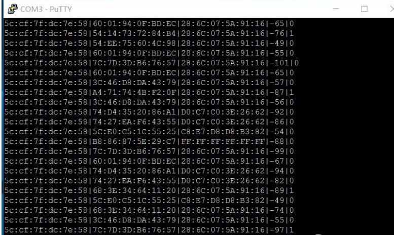 “探针MAC”就是探针本身的MAC地址;   “抓取的设备MAC”指探针抓取到的WiFi信号的发射设备的MAC地址,一般为手机;   “信号强度”指探针抓取到的WiFi信号的强度,最小值为“-100”,一般来说,此值越大表示发射设备离探针越近;   “设备发送的WiFi包的类型”指探针抓取到的WiFi信号的类别,其末位数的值为0、4、8时,分别表示抓取到的WiFi信号为“管理”帧、“控制”帧、“数据”帧;   “时间戳”指探针抓取到WiFi信号的时间,如果探针在局域网内使用而没有接入广域网的话,时间戳可能是不准确的。